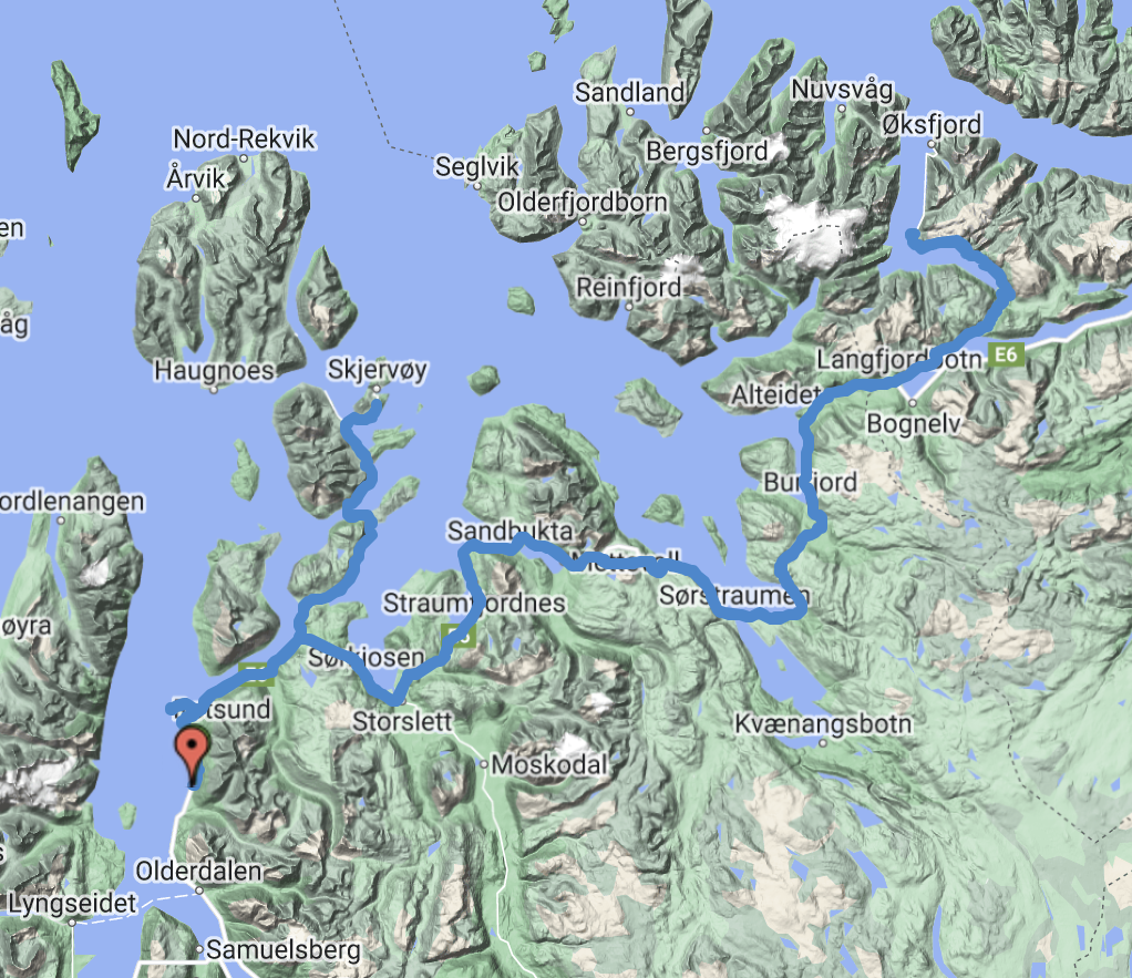 Geplant ist um 7 aufzustehen und über die E6 nach Tromso zu fahren. Es gibt auch eine Fähre, die die Strecke halbieren würde, aber die fährt am Sonntag erst nach 10 Uhr, was deutlich zu spät ist. Von der Reisezeit her wäre es eh kein Unterschied.