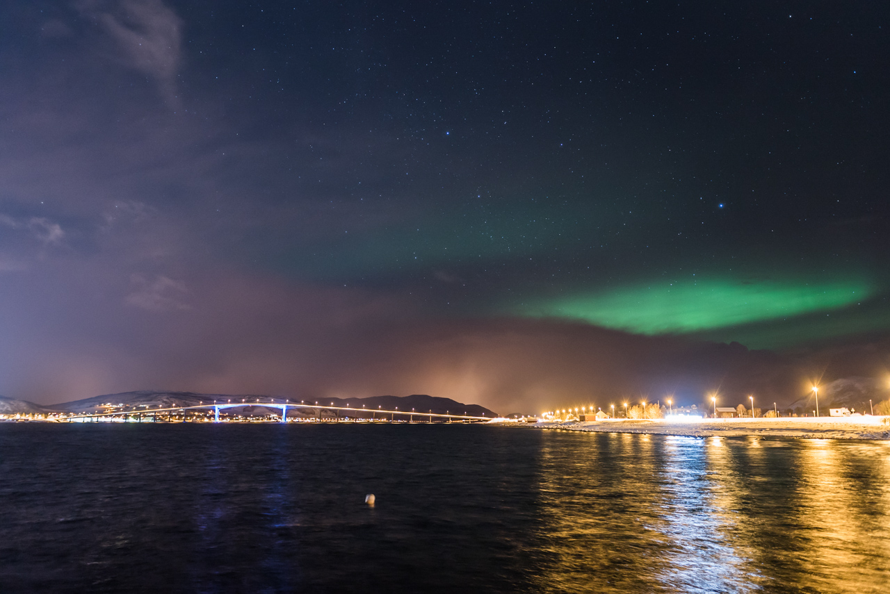 Am Abend sind wir noch nach Sortland gefahren und haben an der Brücke ein paar Fotos gemacht. Das Loch war aber nicht von langer Dauer und Nordlicht war auch nicht viel.